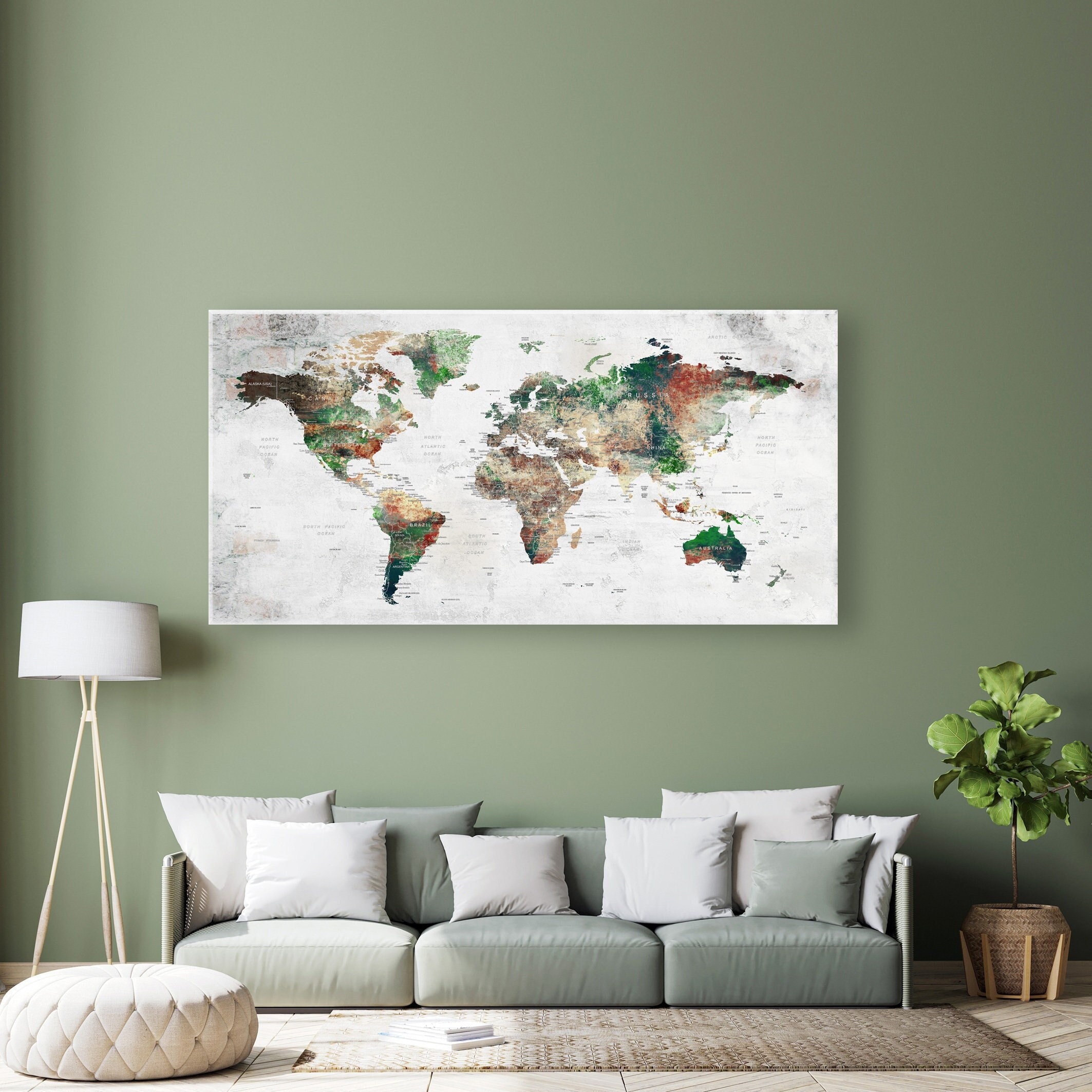 Soft earth's colors detailed world map original design on canvas printing and framed, This map is a push pin travel map.